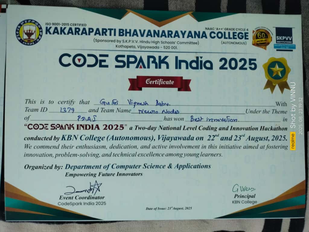 We won the Best Innovation Award at the Code Spark National Level 24-Hour Hackathon for developing NeuroNodes...